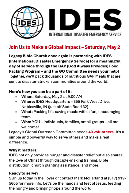 MINISTRY FAIR: April 26 during the Sunday School hour, we will have a ministry fair to give everyone an opportunity to become more familiar with the various ministries available here at Legacy Bible Church. If you are in charge of a ministry at LBC and have not been contacted, email Pastor Jake if you want a table.